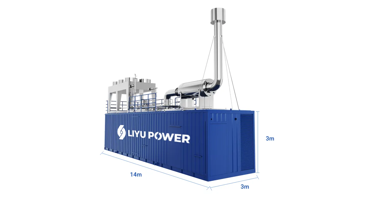 The entire container measures 14 meters in length, 3 meters in width, and 3 meters in height, occupying minimal space and saving land costs for the power plant.